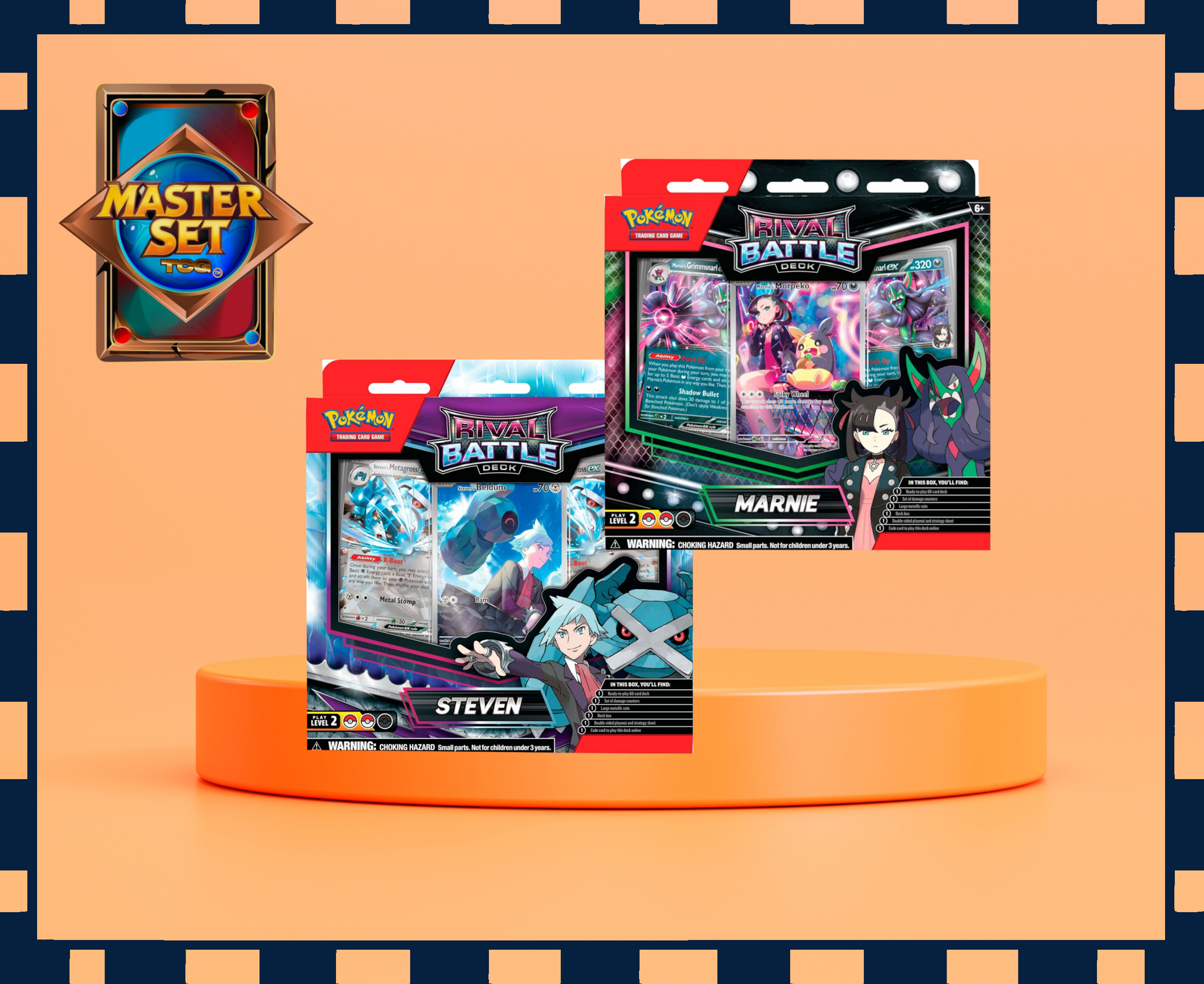 The set of Rivals Battle Decks for Steven & Marnie includes everything you need for two players to prepare and battle. Inside this box, you’ll find: